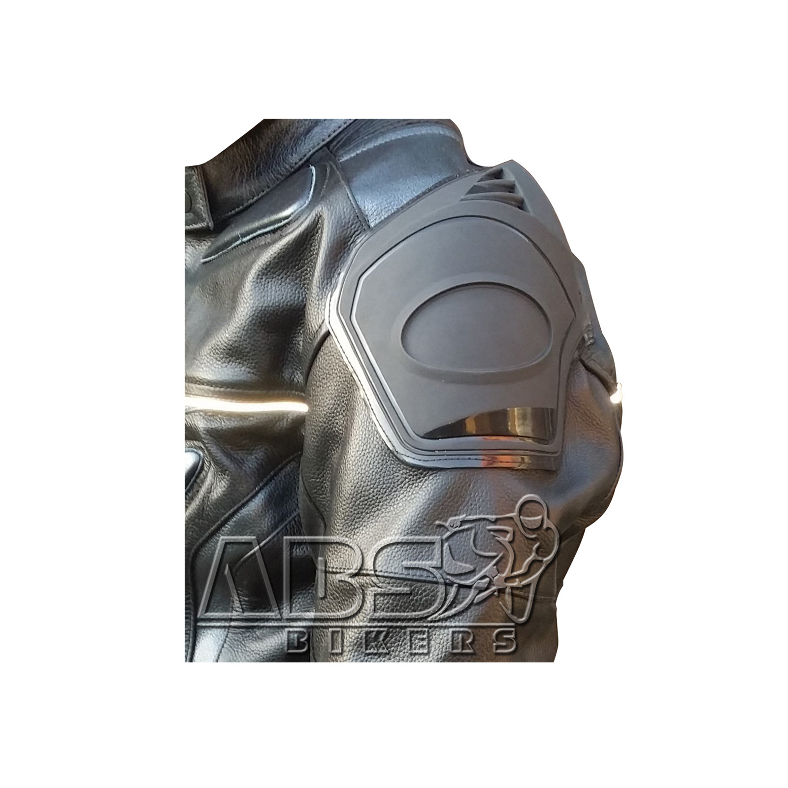 Additional layer of leather is stitched on shoulders and elbows for extra protection from crash and drag.
